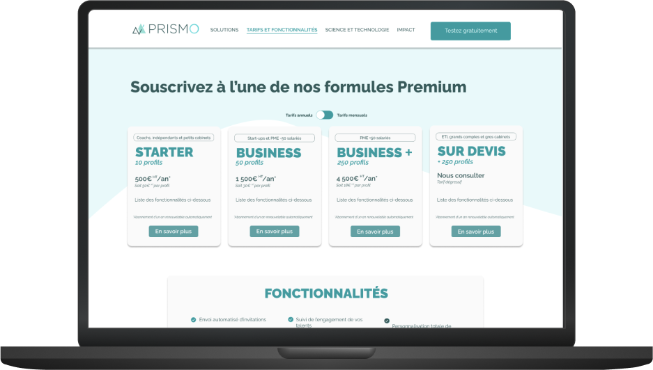 PROJET : Page tarifs et fonctionnalités • Site PRISMO