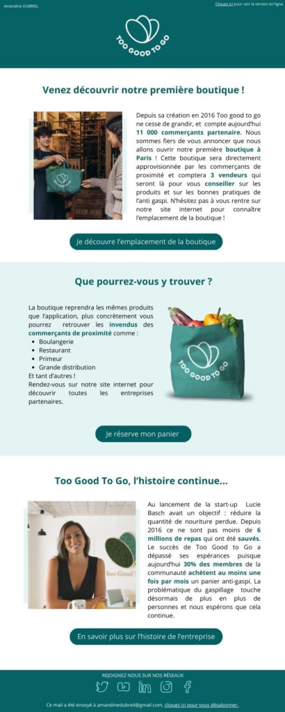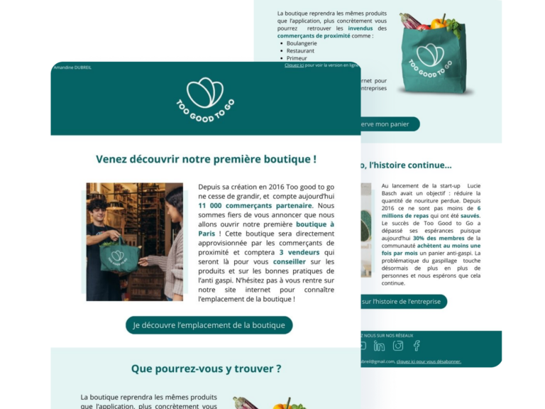Pour un devoir d’école, j’ai réalisé cet emailing à destination des clients réguliers de To Good to Go pour annoncer l’ouverture de la première boutique physique à Paris.